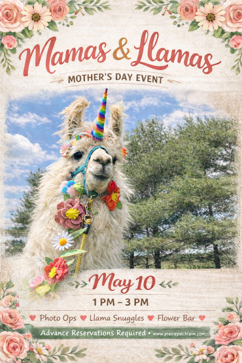 Photo Ops, Llama Snuggles add-on’s to build your own flower bouquet ($20)or llama fiber bird nesting ball ($12)